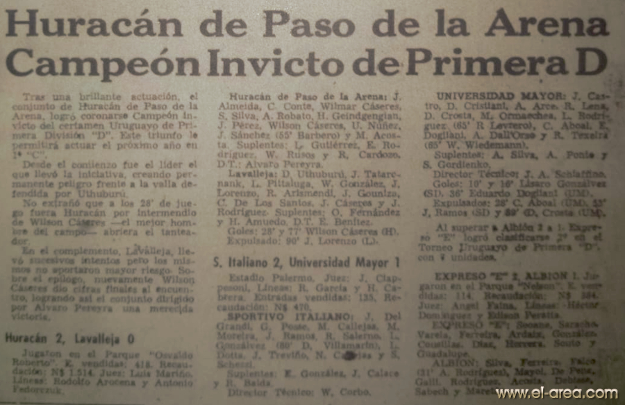 1973- Disputado el Repechaje entra la C y la D, Iriarte, primero, permaneció en la C, Huracán perdió la categoría y volvió a la D y Villa Teresa y Lavalleja, tercero y cuarto respectivamente, permanecieron en la D. El torneo contó con doce equipos pues se afilió Fraternidad y se disputó en dos series.