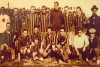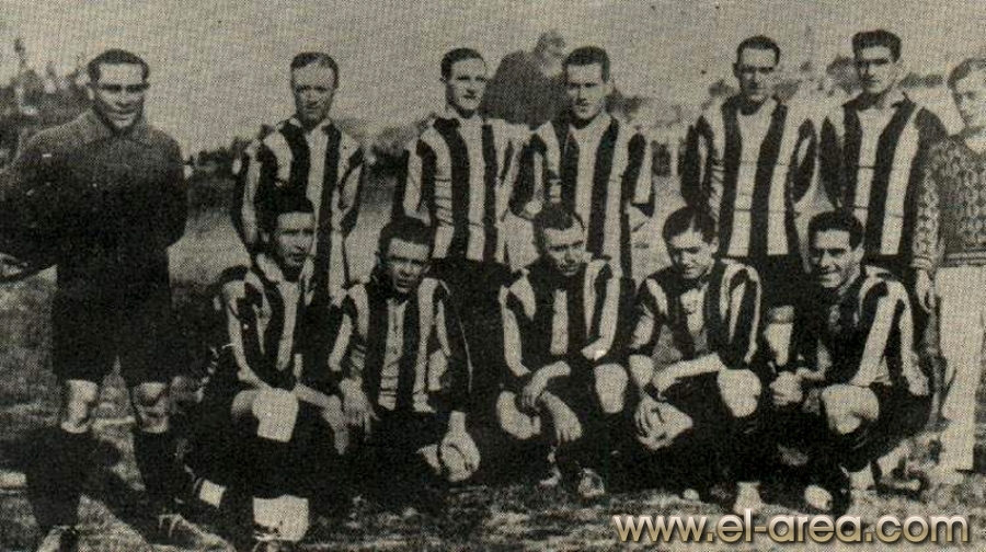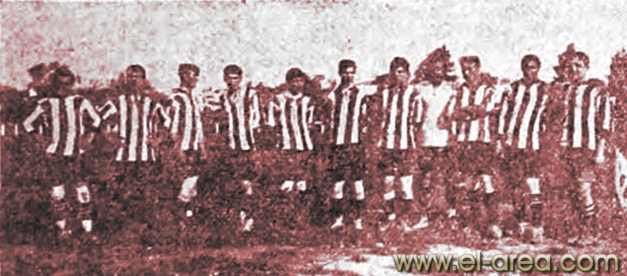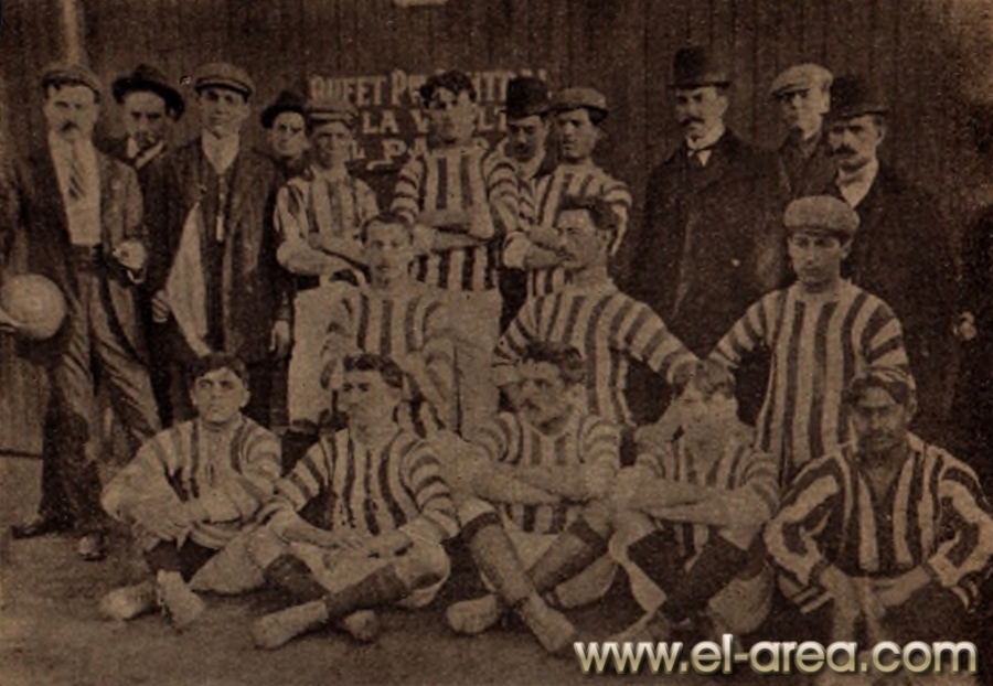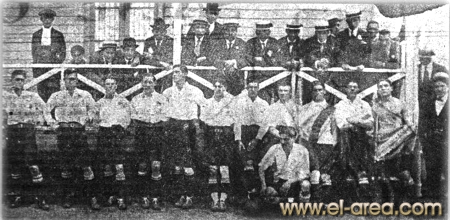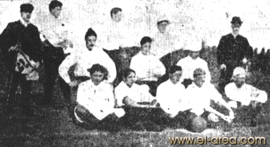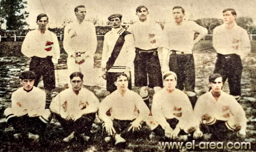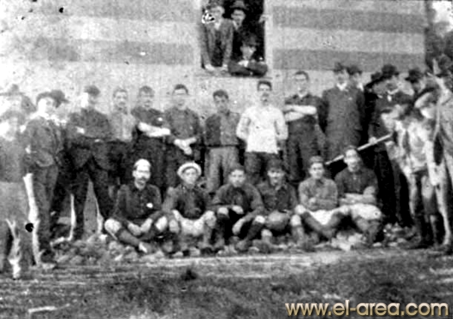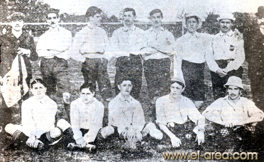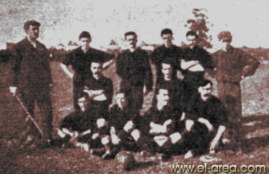 A la izquierda Ferro, a la derecha el C.U.R.C.C. Foto del 11.10.1908, partido amistosos jugado en Caballito (Bs As.) y ganado por los uruguayos por 5-0 (Fuente I Pies de Calumin). |
