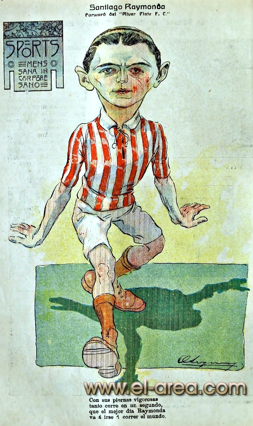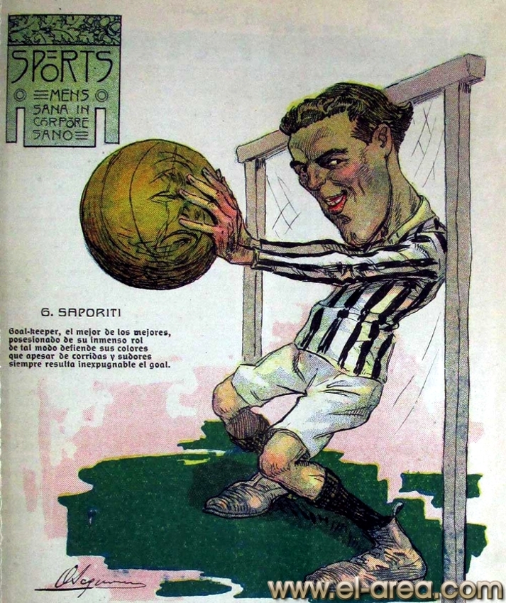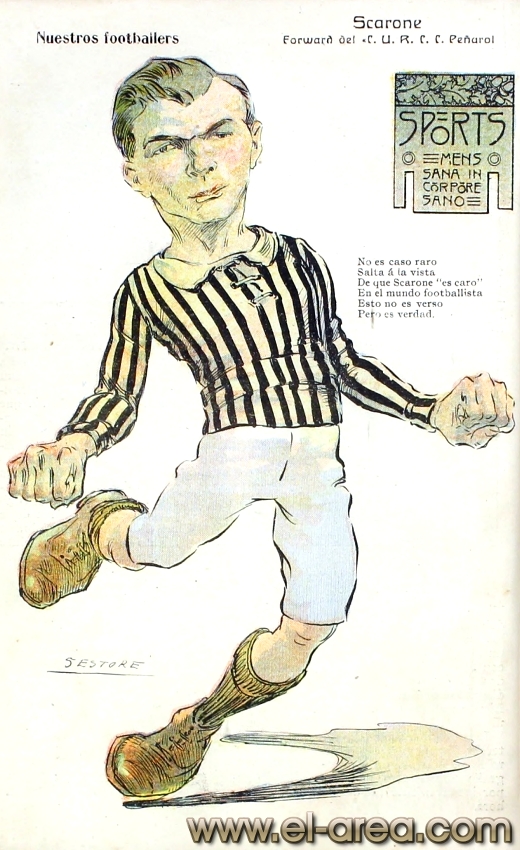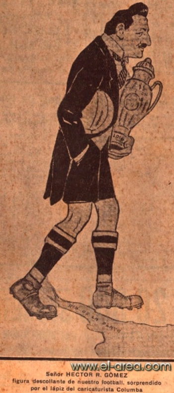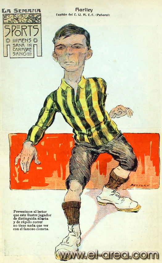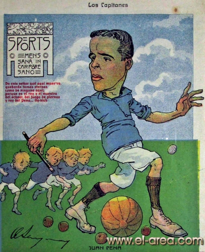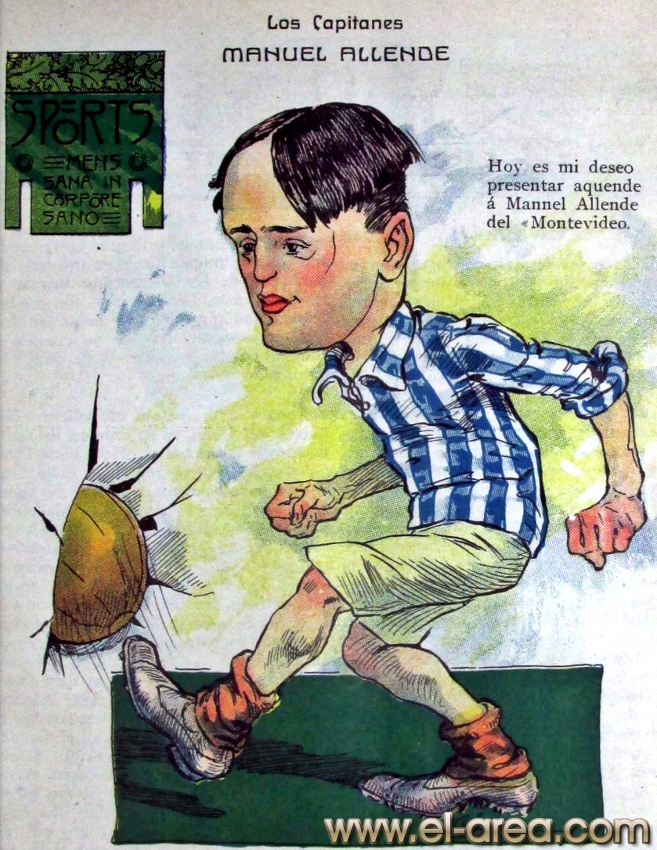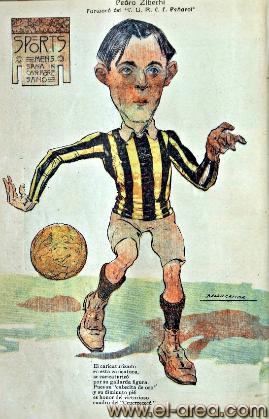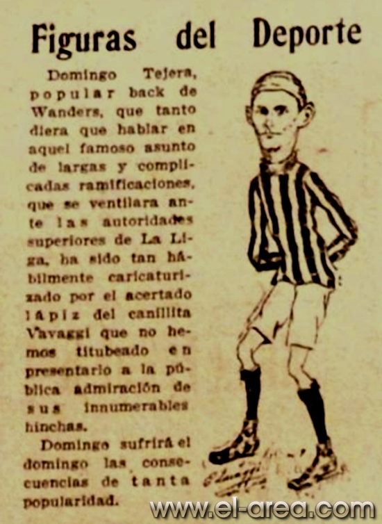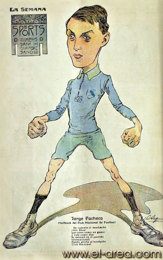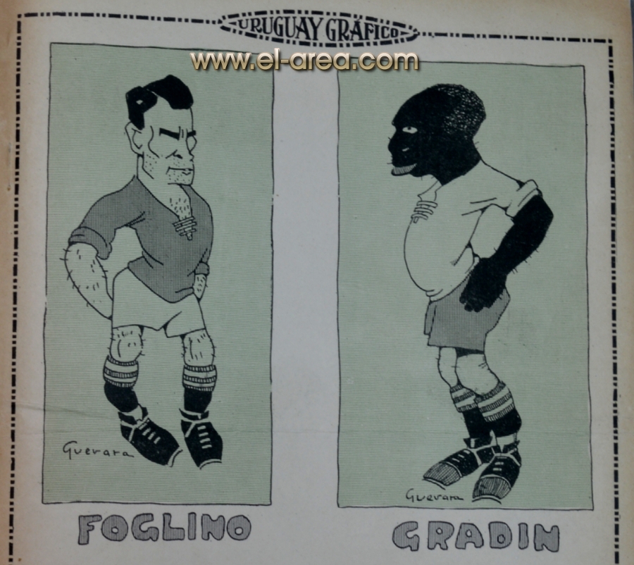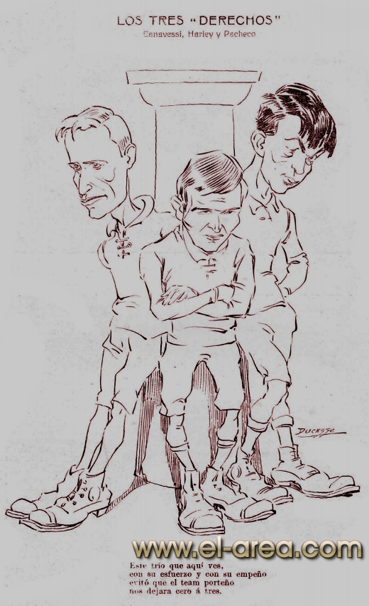 La revista La Semana publicó estas caricaturas de figuras del fútbol en 1909, un año después de los hechos aquí narrados: Aníbal Falco de Nacional, Fernando Lourtet de River Plate, Juan Pena del C.U.R.C.C. y Cayetano Saporiti de Wanderers (Fuente I Ovación Digital). |