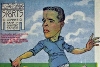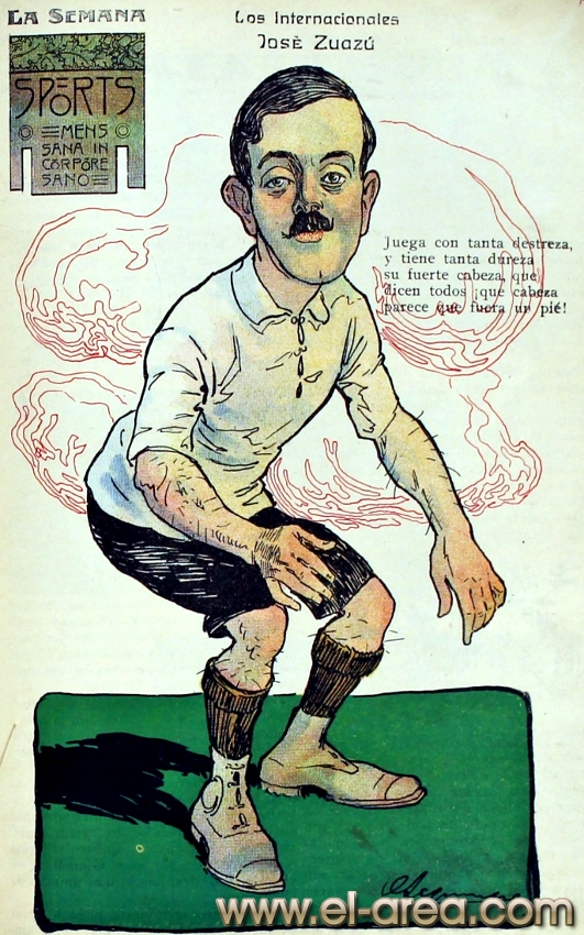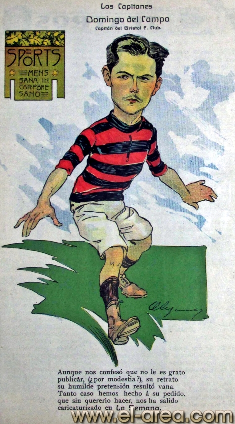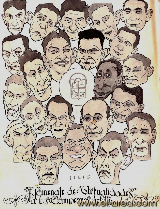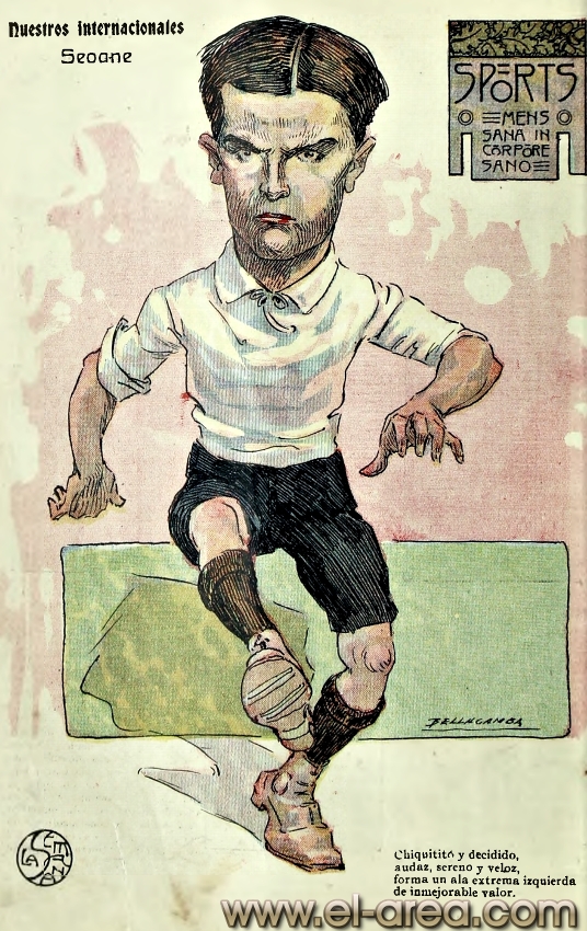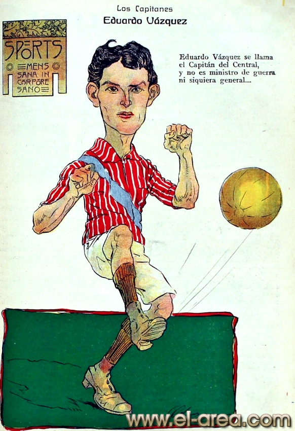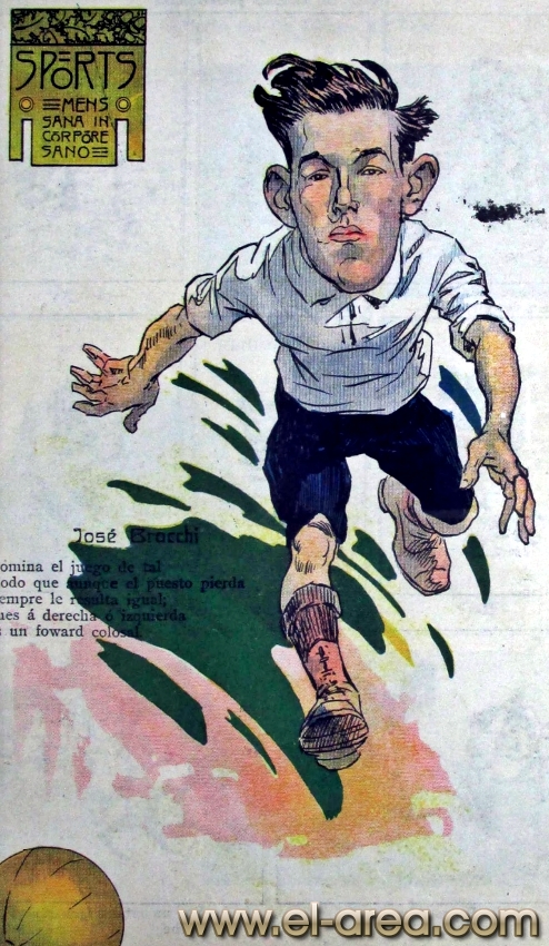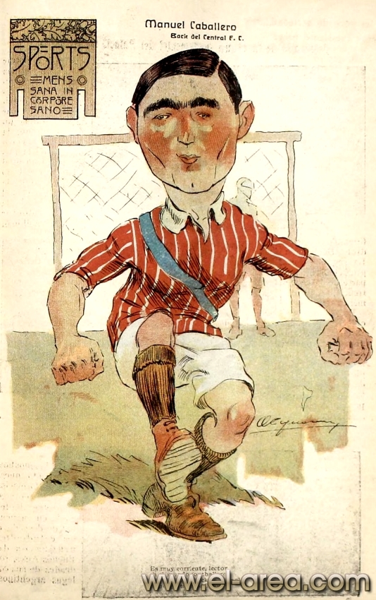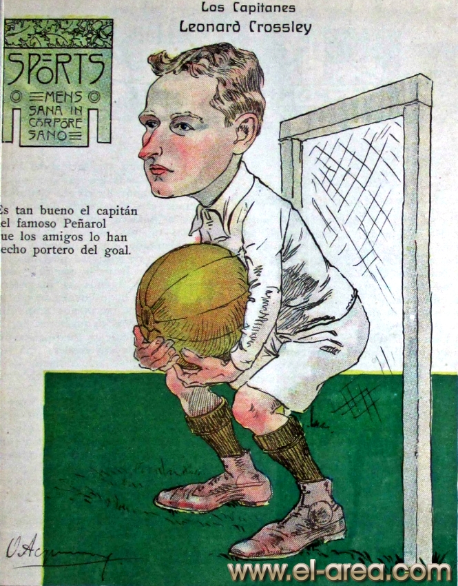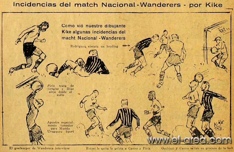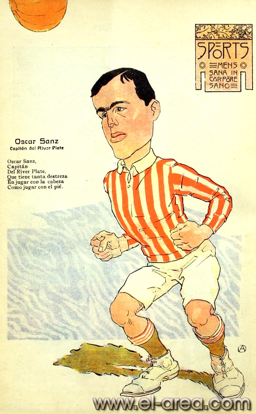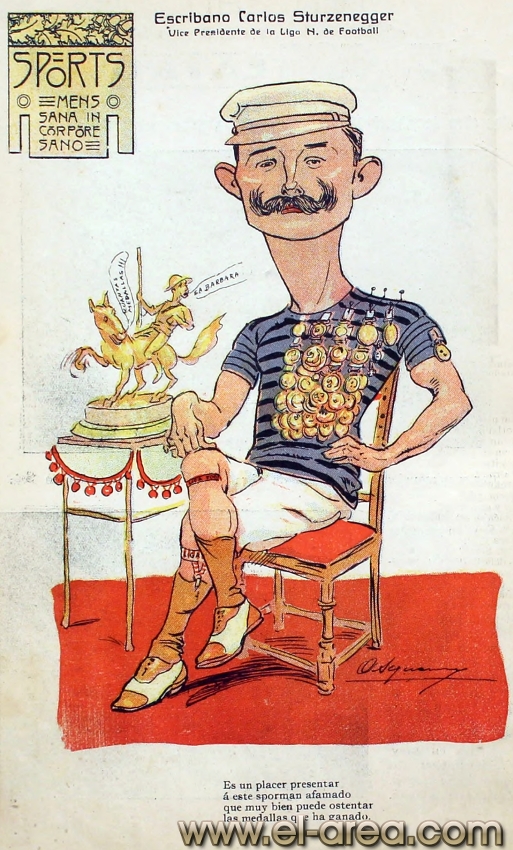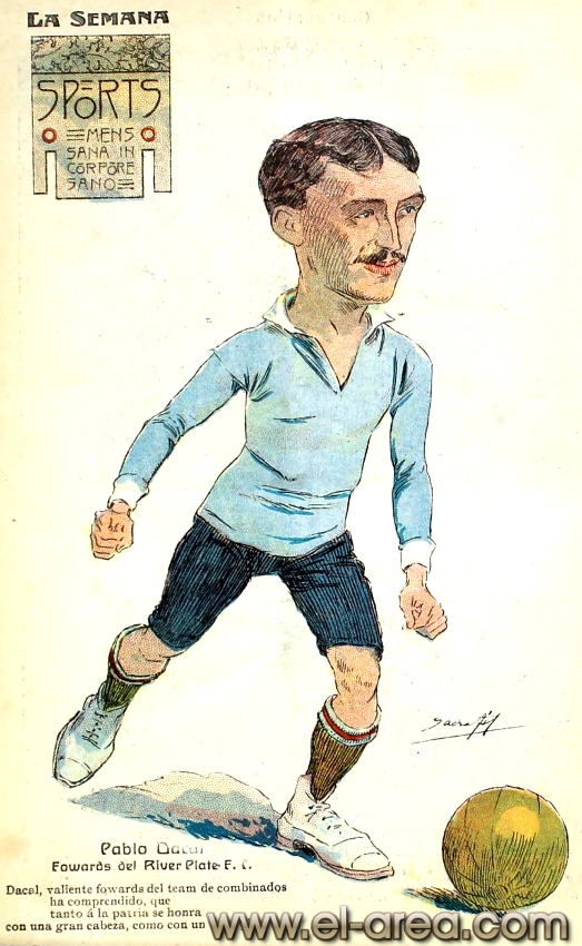 La revista La Semana publicó estas caricaturas de figuras del fútbol en 1909, un año después de los hechos aquí narrados: Aníbal Falco de Nacional, Fernando Lourtet de River Plate, Juan Pena del C.U.R.C.C. y Cayetano Saporiti de Wanderers (Fuente I Ovación Digital). |