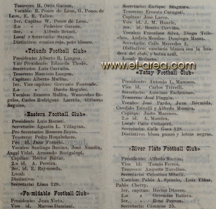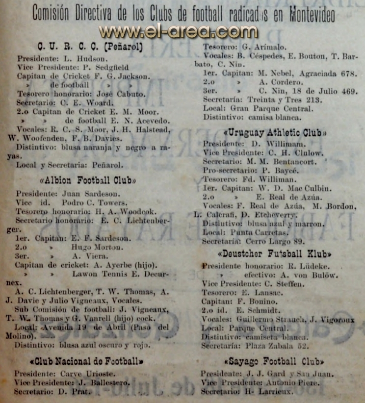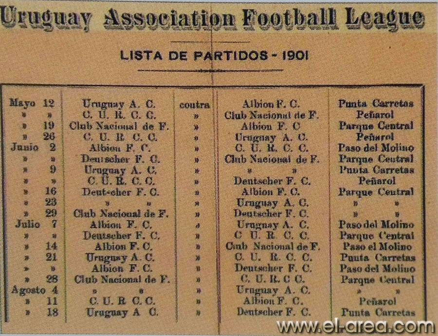 En la última década del siglo XIX, con el Montevideo Cricket Club ya fundado en 1861 –como uno de los primeros difusores de este deporte– comienzan a fundarse clubs (término inglés con origen nórdico para referirse a una unión) que son legendarios en los inicios de nuestro fútbol: Albion y el C.U.R.C.C. (Central Uruguay Railway Cricket Club, en la zona de Peñarol), ambos en 1891, Nacional –primer club de origen criollo en participar del torneo que nos ocupa, aunque se sumó más tarde (1899)–, para pasar a agregar otros que siguen hasta nuestros días. Muchos que –a pesar de que desaparecieron– dejaron una huella y otros que apenas lograron llenar formularios de inscripciones y partidos. Cada fin de semana se disputaba un sinfín de encuentros dentro de las posibilidades de los equipos, sobre todo en los campos libres de la zona de Punta Carretas, donde anteriormente unos señores ataviados con singulares ropas daban de patadas a un balón entre sí: eran los “ingleses locos”, al decir de muchos, que bajaban de los barcos a disfrutar de su juego ante el estupor de quienes los observaban.