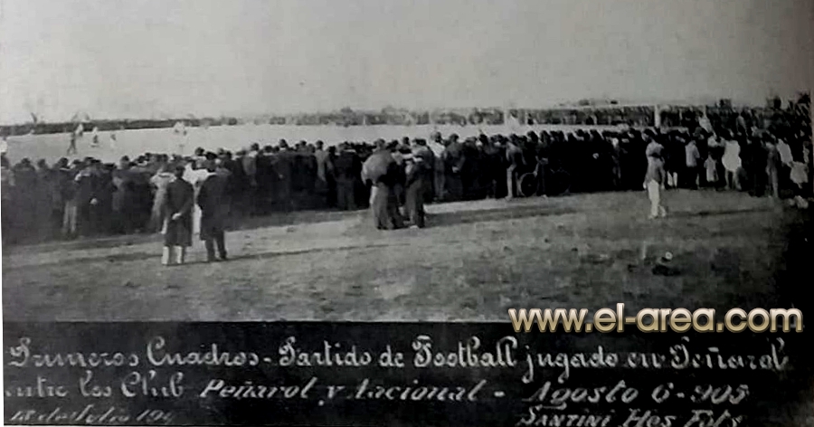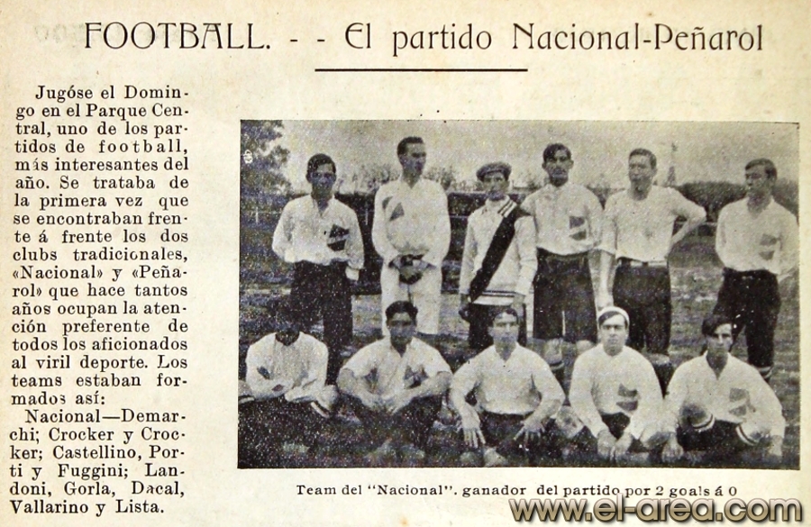 Volviendo al primer torneo, “el Albion usaba como distintivo camisa roja y azul por mitades, y tenía su campo de juego en el camino 19 de Abril; Peñarol vestía camisa a cuadros negros y amarillos y su cancha estaba ubicada en el Pueblo Peñarol; el Deutscher tenía como local de juego la llamada cancha chica del Parque Central, después de haberse inaugurado este, y su color era el blanco, y en cuanto al Uruguay Athletic respondía a la camiseta azul y marrón, también por mitades y su campo de juego se hallaba en Punta Carretas” (8). Entre estos cuatro equipos se dirimió el primer campeón. Nacional no pudo ingresar en este torneo por diferentes motivos, aunque el principal radicaría en su conformación: representaba el fútbol criollo, de ahí su nombre y su emblema. Después de mucho trajinar ingresó en el torneo siguiente, donde rápidamente demostró su valía.