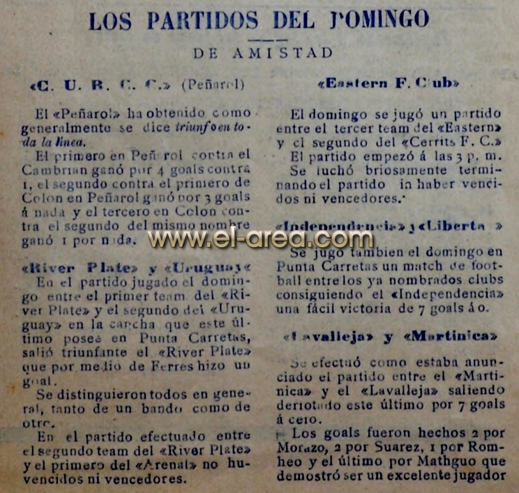 Nacional jugó, en el interín de su deserción del torneo doméstico, dos partidos contra el San Isidro argentino. El tricolor venció 2-0 en Argentina y 3-2 en Montevideo y luego venció también al team argentino Porteño F.C. por 4-1. El C.U.R.C.C. también concertó dos amistosos ante otro club argentino y ferroviario, Ferro Carril Oeste de Buenos Aires (que militaba en la Segunda División argentina). Ganó ambos, 5-0 de visitante (con tres goles de Piendibene y dos de Canavessi) y 1-0 en pueblo Peñarol. Más importante que eso, descubrió en su rival a un centre half escocés de notables condiciones, John Harley. Pronto lo tuvo en sus filas. Y Harley enseñó a los uruguayos el passing game escocés, el juego de pases que transformaría la forma de concebir el fútbol en este país.