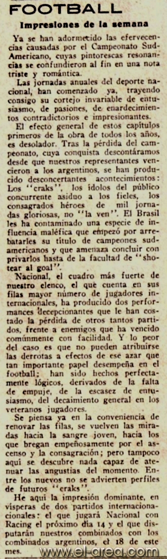 Según el diario El Siglo del 17 de octubre, Nacional “resolvió retirar sus equipos y cesar su afiliación a aquella corporación”. Sin embargo, días más tarde La Tribuna Popular publicó: “A las muchas cartas que hemos recibido sobre este asunto manifestamos que lo único que hay de cierto es que ‘Nacional’ ha retirado sus teams de la Liga sin dejar de quedar afiliado a la Liga Uruguaya de Football”.
