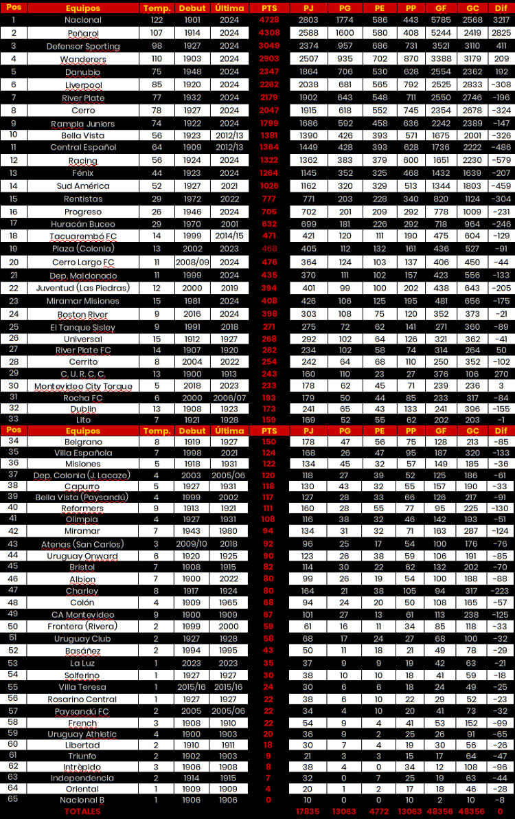 Los sistemas de competencia uruguayos siempre se han caracterizado por un enrevesado espíritu rector de innecesaria complicación. Para despejar dudas se ofrece a continuación un cuadro esquemático y cronológico de la evolución de las divisionales y sistemas de competición diseñado por el gran estadígrafo argentino y amigo Gabriel Ladetto Porrini, poseedor de un conocimiento enciclopédico único sobre la trayectoria de equipos, jugadores y demás temática referida al fútbol nacional.